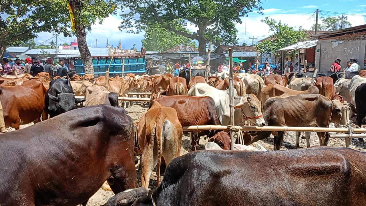 কালো সাদা বাদামী ছোপ ছোপ রঙের গরু যেগুলো মঙ্গলবার সকাল থেকেই আসছে নসিমন, করিমন, ভটভটি, পায়ে হেঁটে বিভিন্ন গরুর ব্যাপারীরা আশপাশের জেলার উপজেলার গরু নিয়ে আসছেন। ছাগল নিয়ে আসছেন। এবং অন্যান্য পণ্য বিক্রি করতে আসছেন এই ঐতিহ্যবাহী প্রাচীন জাদুরানী বাজারে।