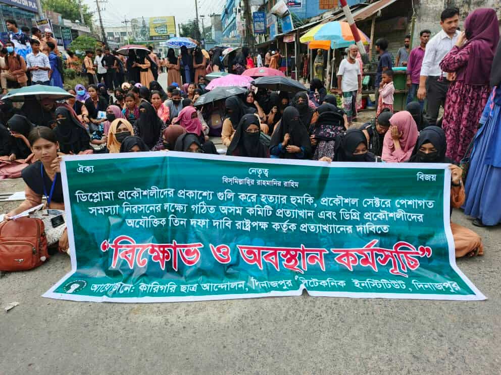 দিনাজপুর কারিগরি ছাত্র আন্দোলন দিনাজপুর পলিটেকনিক ইনস্টিটিউট এর উদ্যোগে দিনাজপুরে বিক্ষোভ কর্মসূচি পালন করে ডিপ্লোমা প্রকৌশলীদের প্রকাশ্যে গুলি করে হত্যার হুমকি, প্রকৌশল সেক্টরে পেশাগত সমস্যা নিরসনের লক্ষ্যে গঠিত অসম কমিটি প্রত্যাখান এবং ডিগ্রি প্রকৌশলীদের অযৌক্তিক ৩ দফা দাবি রাষ্ট্রপক্ষ কর্তৃক প্রত্যাখ্যানের দাবিতে ১৭ সেপ্টেম্বর ২০২৫ বুধবার সকালে দিনাজপুর ফুলবাড়ি বাস স্ট্যান্ডে রেল লাইনের উপর রেল অবরোধ ও বিক্ষোভ অবস্থান কর্মসূচি পালন করে।