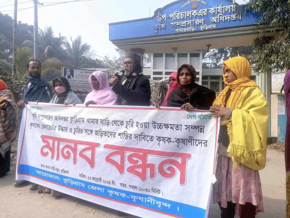 রতি কান্ত,কুড়িগ্রাম প্রতিনিধি: কুড়িগ্রাম কৃষি সম্প্রসারণ অধিদপ্তর (খামারবাড়ি) থেকে অর্ধ কোটি টাকা মূল্যের উচ্চক্ষমতাসম্পন্ন জেনারেটর চুরি ও আত্মসাতের প্রতিবাদে এবং চুরির সঙ্গে জড়িতদের শাস্তির দাবীতে মানববন্ধন করেছেন কৃষকরা।মঙ্গলবার (২৩ জানুয়ারি) সকাল ১১টায় কুড়িগ্রাম খামারবাড়ি অফিসের সামনে কুড়িগ্রাম-চিলমারী সড়কে ঘন্টাব্যাপী মানববন্ধন করে কুড়িগ্রামের পাঁচ শতাধিক কৃষক-কৃষাণী।