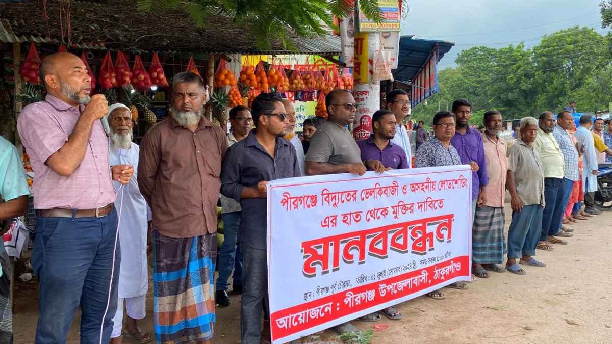 সোমবার (১ জুলাই ) সকাল ১১ টার দিকে পীরগঞ্জ পৌর শহরের পূর্ব চৌরাস্তায় উপজেলাবাসীর পক্ষ থেকে এ মানববন্ধন করা হয়।