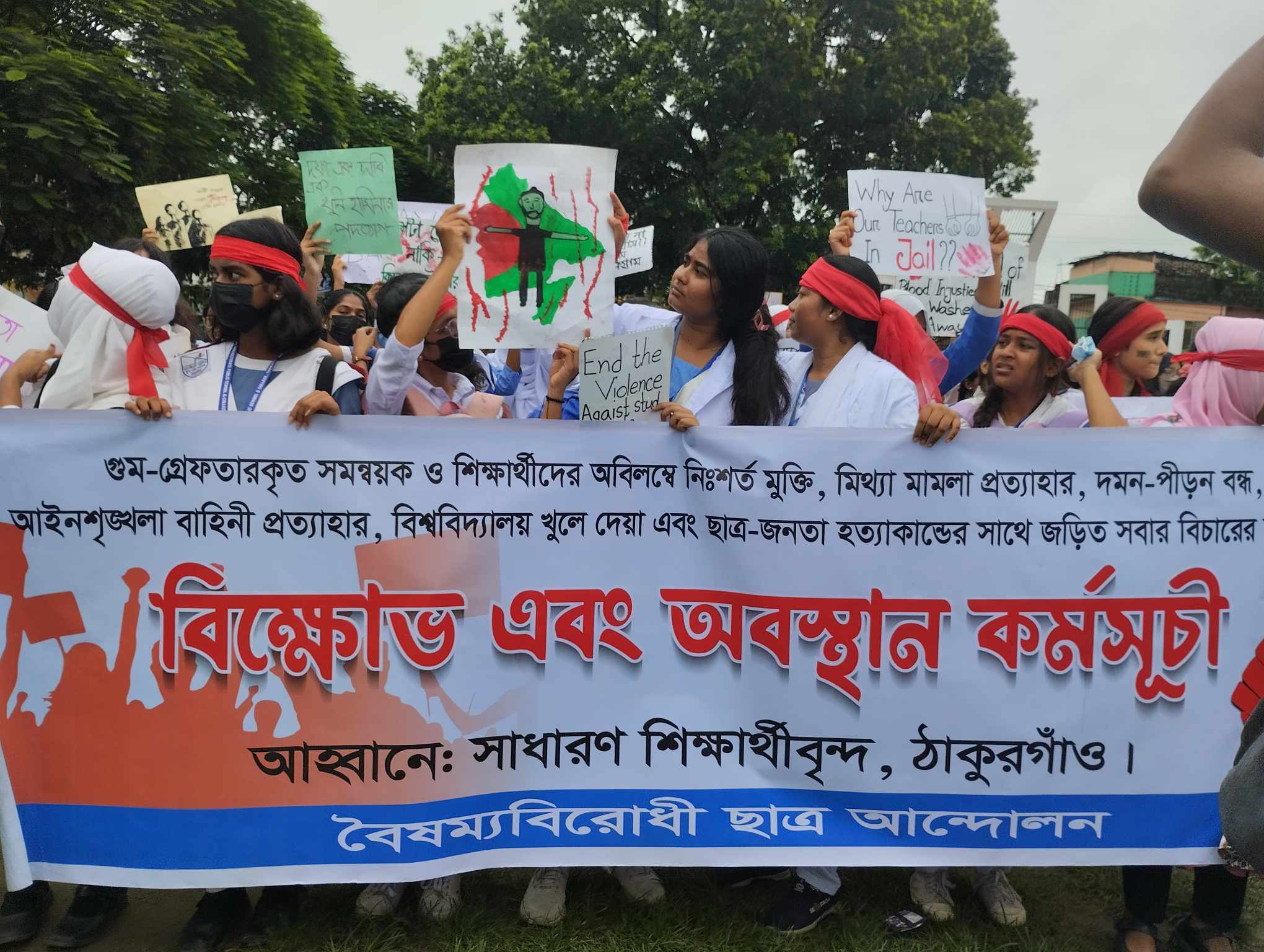 ঠাকুরগাঁওয়ে বৃষ্টিকে উপেক্ষা করে বৈষম্য বিরোধী ছাত্র আন্দোলনে শিক্ষার্থীরা।