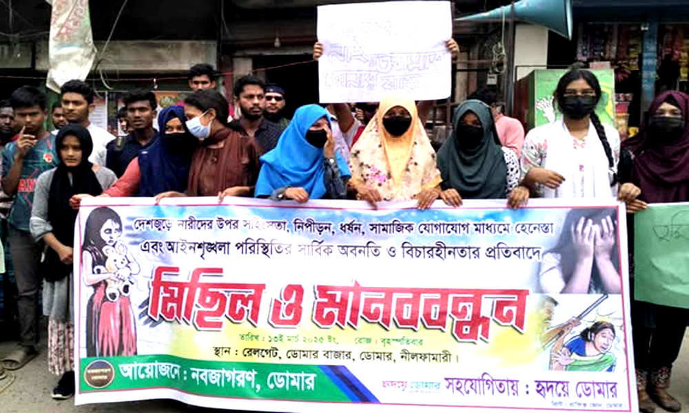 মোসাদ্দেকুর রহমান সাজু,ডোমার নীলফামারী প্রতিনিধিঃ সারাদেশজুড়ে নারীর প্রতি সহিংসতা, ধর্ষণ, সামাজিক যোগাযোগ মাধ্যমে হেনস্তা এবং আইন-শৃঙ্খলা পরিস্থিতির অবনতি ও বিচারহীনতার প্রতিবাদে নীলফামারীর ডোমারে বিক্ষোভ মিছিল ও মানববন্ধন কর্মসূচি পালিত হয়েছে।