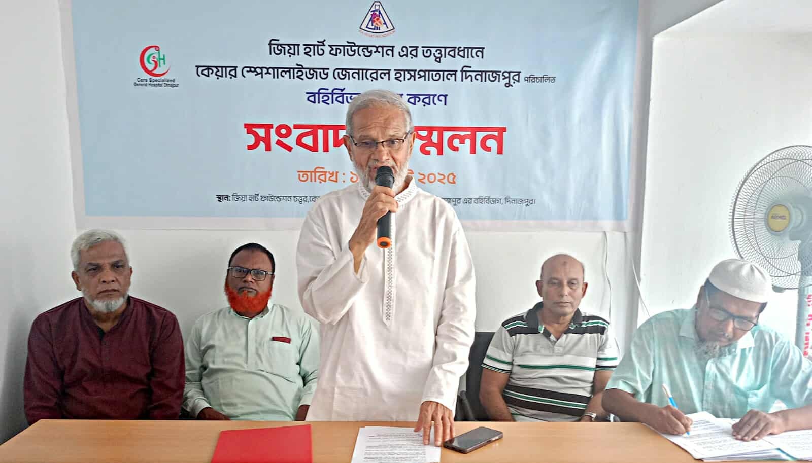 জিয়া হার্ট ফাউন্ডেশনের তত্ত্বাবধানে কেয়ার স্পেশালাইজড জেনারেল হাসপাতাল দিনাজপুর পরিচালিত বহির্বিভাগ চালুকরণে ১৫ জুলাই ২০২৫ মঙ্গলবার বেলা সাড়ে ১১টায় জিয়া হার্ট ফাউন্ডেশন চত্বরের কেয়ার স্পেশালাইজড জেনারেল হাসপাতাল দিনাজপুরের বর্হিবিভাগে সংবাদ সম্মেলন করেছে কর্তৃপক্ষ।