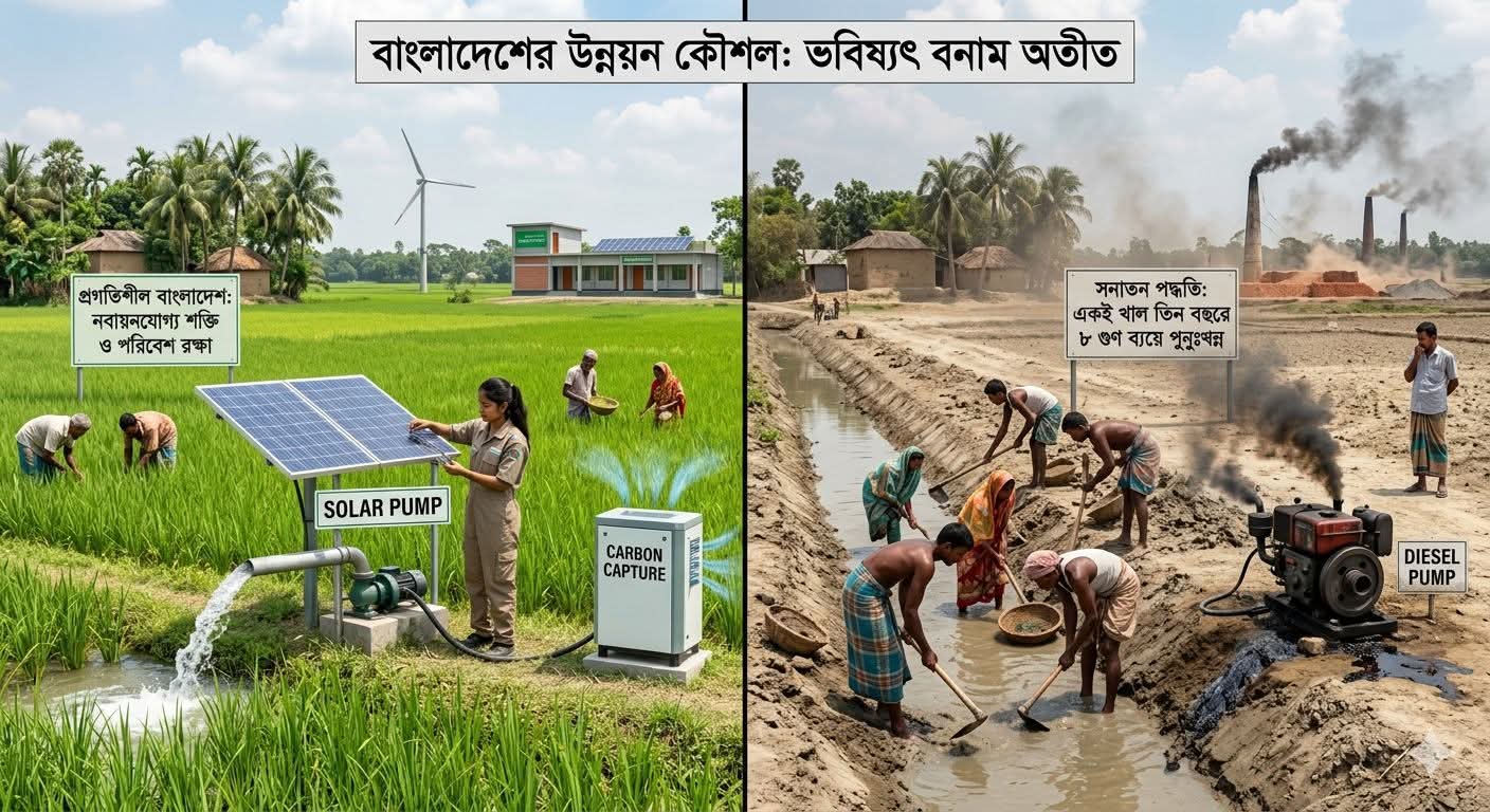 ​দুঃখজনক হলেও সত্য, যেখানে আমরা বাতাসে মিশে থাকা বিষাক্ত কার্বন-ডাই-অক্সাইডকে সম্পদে রূপান্তর করতে পারতাম, সেখানে আমরা একই খাল তিন বছরে আট গুণ বেশি খরচ করে কাটছি! কার্বন নিঃসরণকারী ডিজেল পাম্পের বদলে সোলার পাম্প কিংবা বাতাসের আর্দ্রতা থেকে পানি সংগ্রহের প্রযুক্তি ব্যবহার এখন সময়ের দাবি।