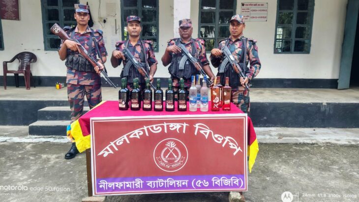 বিজিবি জানায়, শুক্রবার (১০ এপ্রিল ২০২৬) দুপুরে নীলফামারী ৫৬ বিজিবি ব্যাটালিয়নের আওতাধীন মালকাডাঙ্গা বিওপির দায়িত্বপূর্ণ এলাকায় অভিযান চালায় বিজিবি সদস্যরা। এসময় সীমান্ত পিলার ৭৭৫/১১এস থেকে প্রায় ৮০০ গজ বাংলাদেশের অভ্যন্তরে নাওতরী প্রাইমারি স্কুল সংলগ্ন এলাকা থেকে মালিকবিহীন অবস্থায় ভারতীয় বিভিন্ন ব্র্যান্ডের ১৮ বোতল মদ উদ্ধার করা হয়।