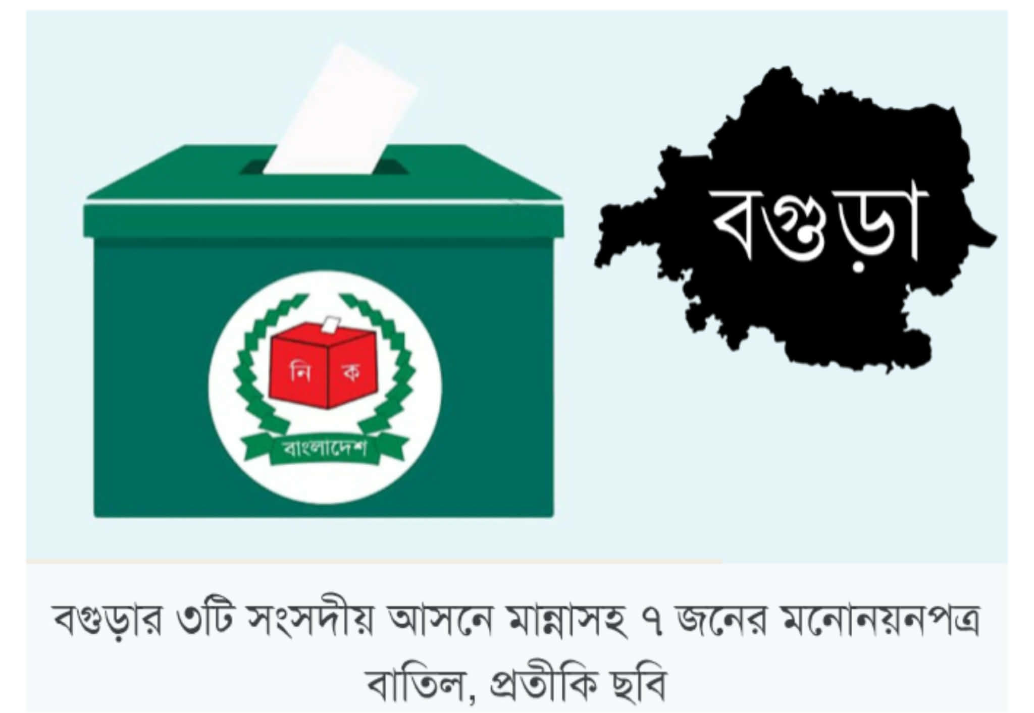 ত্রয়োদশ জাতীয় সংসদ নির্বাচনে যাচাই বাছাইয়ের প্রথম দিন বগুড়া-২(শিবগঞ্জ) আসনে বিএনপি জোটের প্রার্থী নাগরিক ঐক্য‘র সভাপতি মাহমুদুর রহমান মান্নাসহ বগুড়ার তিনটি সংসদীয় আসনে ৭ প্রার্থীর মনোনয়ন পত্র বাতিল করা হয়েছে। আজ শুক্রবার মনোনয়নপত্র বাছাইয়ের প্রথম দিন সকাল ১০ টায় জেলা রিটার্নিং অফিসার ও জেলা প্রশাসকের কার্যালয়ে মনোনয়ন পত্র যাচাই বাছাই কার্যক্রম চলে।
