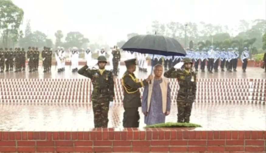 প্রধান উপদেষ্টা প্রথমে এককভাবে শ্রদ্ধা নিবেদন করেন। এরপরে বাকি ১৩ উপদেষ্টাকে সঙ্গে নিয়ে শ্রদ্ধা নিবেদন করা হয়। বৃষ্টিতে ভিজে ভিজেই তাঁরা শ্রদ্ধা জানান। আইনশৃঙ্খলা রক্ষাকারী বাহিনীর সদস্যরা এ সময় ছাতা নিয়ে আসেন।