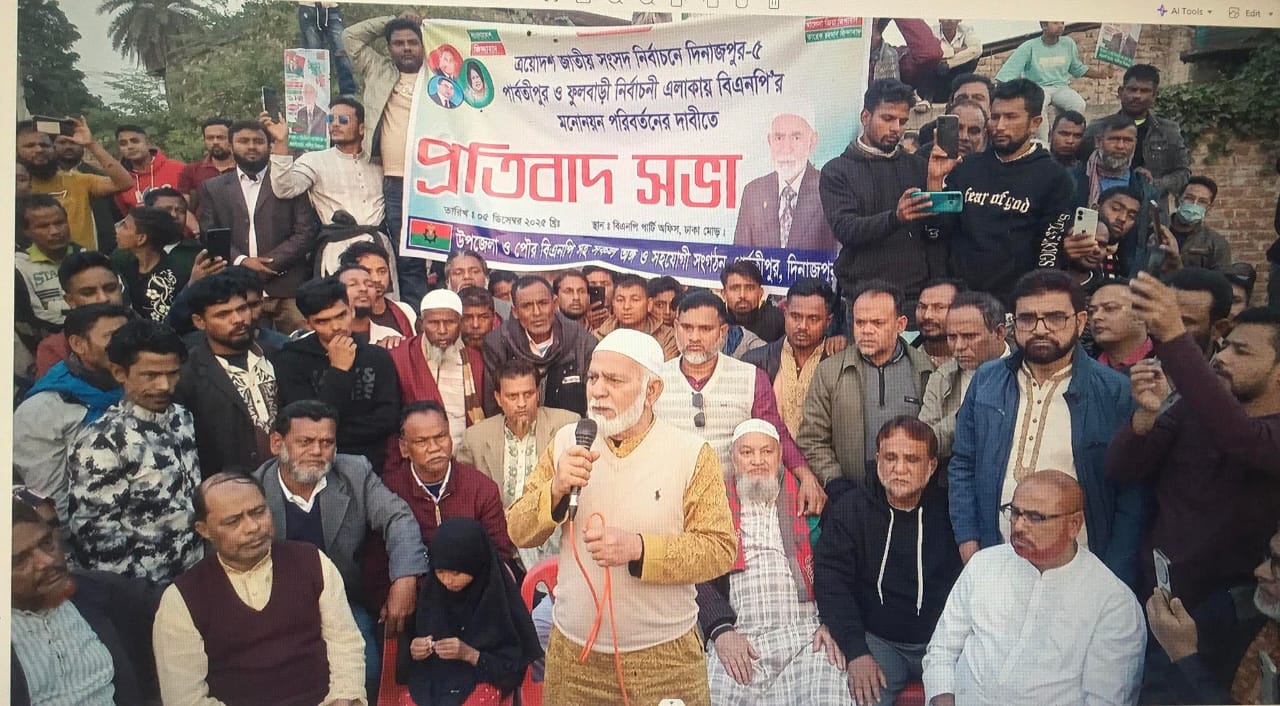 দিনাজপুরের পার্বতীপুরে ত্রয়োদশ জাতীয় সংসদ নির্বাচনে দিনাজপুর-৫ পার্বতীপুর ও ফুলবাড়ী নির্বাচনী এলাকায় বিএনপি’র মনোনয়ন পরিবর্তনের দাবীতে আজ ৫ ডিসেম্বর বিকাল ৩ টায় ঢাকা মোড়স্হ বিএনপি কার্যালয়ে প্রতিবাদ সভা অনুষ্ঠিত হয়েছে। উক্ত প্রতিবাদ সভায় উপজেলা ও পৌর বিএনপি সহ সকল অঙ্গ ও সহযোগী সংগঠনবৃন্দের উপস্হিতিতে