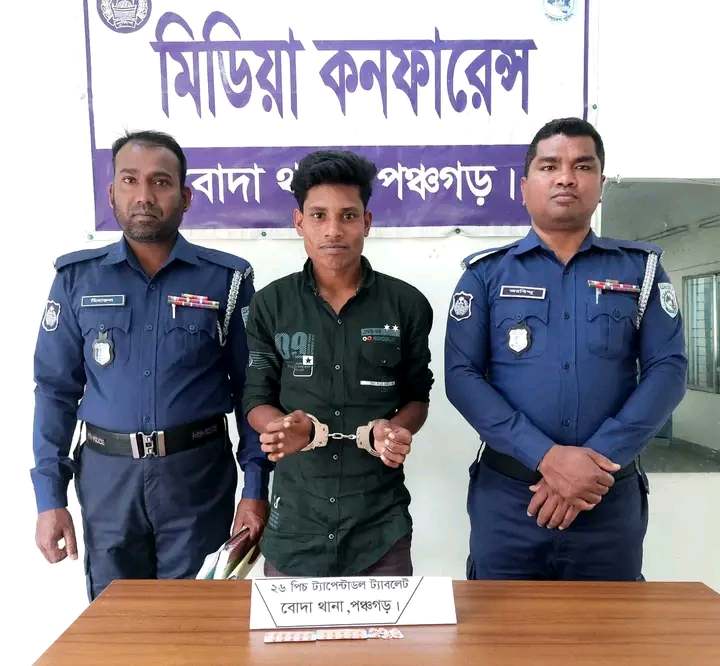 আল মামুন,বোদা, পঞ্চগড় প্রতিনিধি: পঞ্চগড় জেলার সম্মানিত পুলিশ সুপার জনাব এস এম সিরাজুল হুদা, পিপিএম-বার, সহকারী পুলিশ সুপার (বি-সার্কেল) জনাব রুনা লায়লা মহোদয়গনের দিক-নির্দেশনায় বোদা থানার অফিসার ইনচার্জ জনাব মোঃ মোজাম্মেল হক পিপিএম এর নেতৃত্বে বোদা থানার এস আই মোঃ জাহাঙ্গীর আলম, এসআই মোঃ আব্দুর রাজ্জাক, এএসআই আসাদুজ্জামান প্রমাণিক ও সঙ্গীয় ফোর্সের সমন্বয়ে গঠিত আভিযানিক দল বিশেষ অভিযান পরিচালনা করে ১২/০৩/২০২৪ খ্রিঃ ১৩.২০ ঘটিকায় বোদা থানাধীন বোদা পৌরসভার সরদারপাড়া গ্রামস্থ জনৈক আফসার আলীর বসতবাড়ি হতে  অনুমান ৫০ গজ দক্ষিণে বোদা হতে দেবীগঞ্জ এশিয়ান হাইওয়ের পাকা রাস্তা সংলগ্ন লিচু বাগান হতে নেশা জাতীয় মাদকদ্রব্য ট্যাপেন্ডাডল ট্যাবলেট বিক্রয়ের সময় আসামি ১।মোঃ আব্দুল মান্নান(২৪), পিতা- মৃত আফসার আলী, সাং-হাজীপাড়া, ডাকঘর বগদুলঝুলা, থানা-বোদা, জেলা-পঞ্চগড়কে ২৬ পিচ ট্যাপেন্ডাডল ট্যাবলেট/মাদকদ্রব্য সহ হাতে নাতে ধৃত করা হয়। এসআই মোঃ জাহাঙ্গীর আলম এর আনীত অভিযোগের প্রেক্ষিতে আসামি মো: আব্দুল মান্নান এর  বিরুদ্ধে বোদা থানার মামলা নং ০৯, তারিখ ১২/০৩/২০২৪, ধারা -২০১৮ সালের মাদকদ্রব্য নিয়ন্ত্রণ আইনের ৩৬(১) সারণির ২৯(ক) রুজু করা হয়েছে। আসামিকে যথা সময়ে বিজ্ঞ আদালতে সোপর্দ্দ করা হয়েছে। মাদকের বিরুদ্ধে বোদা থানা পুলিশের বিশেষ অভিযান অব্যাহত থাকবে।