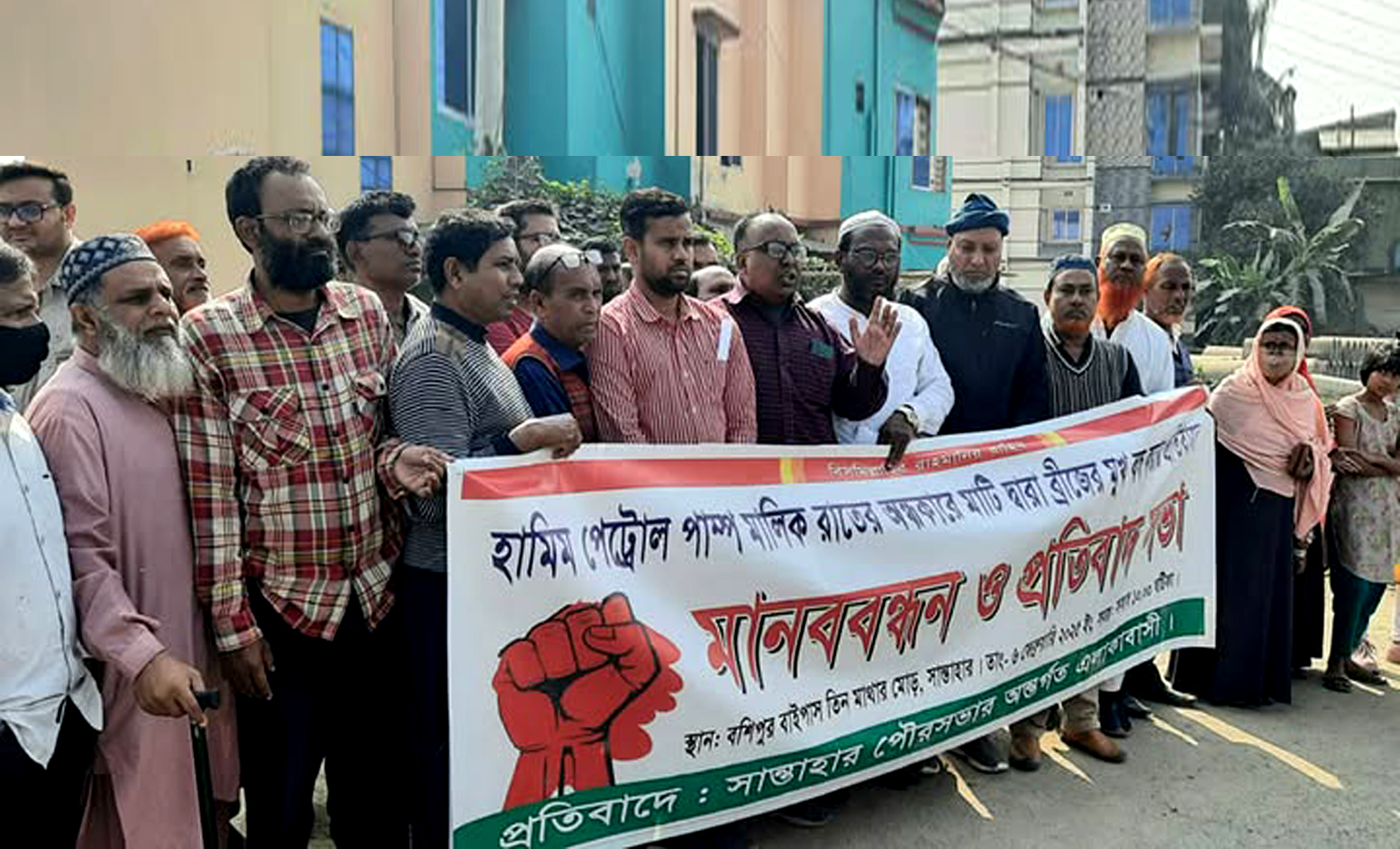 সান্তাহার পৌরসভার তিন নম্বর ওয়ার্ডের এলাকাবাসীর আয়োজনে মানববন্ধন ও প্রতিবাদ সভার সভাপতিত্বে করেন সান্তাহার পৌরসভার বিশিষ্ট ব্যবসায়ী ও সমাজসেবক নিজামুল আলম বৃত্তি। প্রতিবাদ সভায় বক্তব্য রাখেন, সান্তাহার পৌর বিএনপির সাধারণ সম্পাদক এস এম আখতারুজ্জামান মিঠু, সান্তাহার শখের পল্লী স্বত্বাধিকারী বীর মুক্তিযোদ্ধা নজরুল ইসলাম, সান্তাহার পৌর বিএনপির সহ-সভাপতি ইকবাল হোসেন, সাংগঠনিক সম্পাদক মামুনুর রশীদ মামুন, সাবেক কাউন্সিলর শাকিল আলম, বীর মুক্তিযোদ্ধা ওমর ফারুক, বায়তুল আমান জামে মসজিদের সাধারণ সম্পাদক এমদাদুল হক।