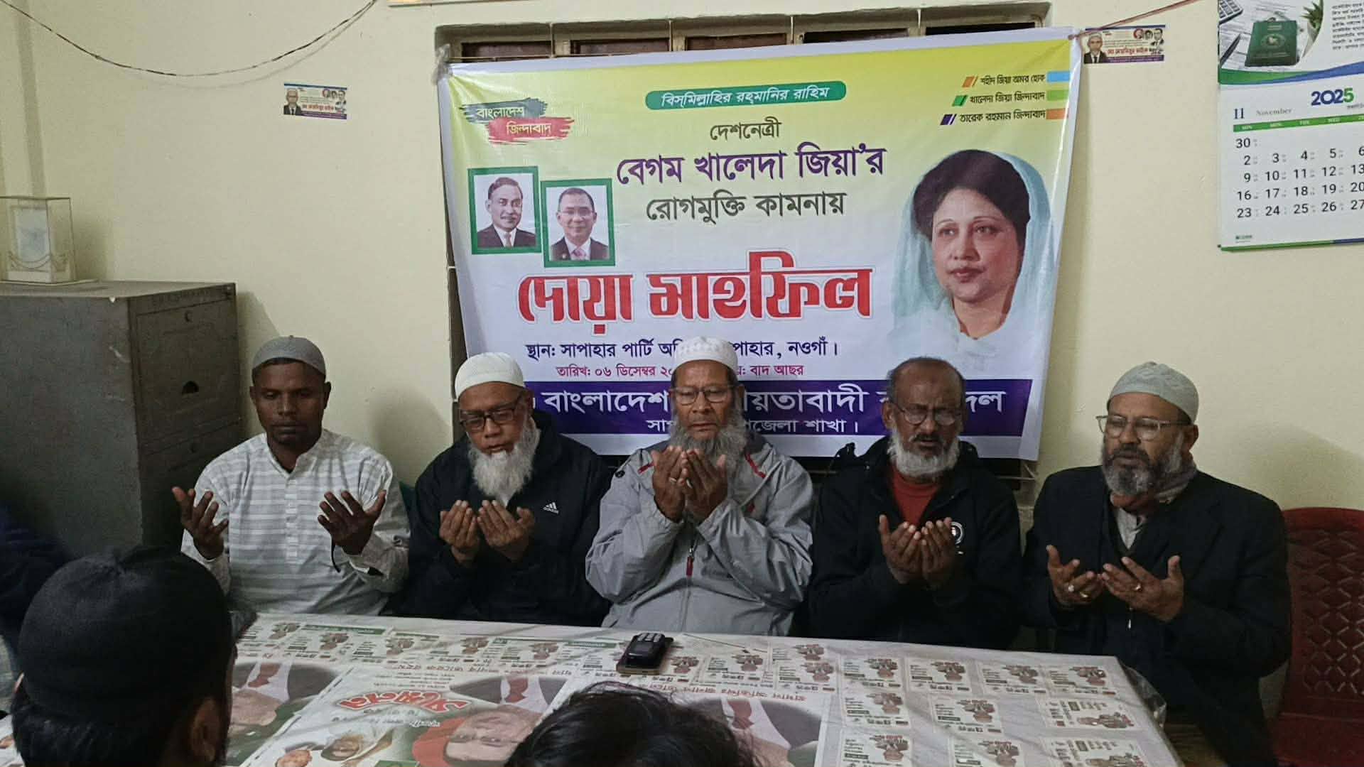 নওগাঁর সাপাহারে বিএনপি চেয়ারপার্সন ও সাবেক প্রধানমন্ত্রী বেগম খালেদা জিয়ার রোগমুক্তি কামনায় দোয়া মাহফিল অনুষ্ঠিত হয়েছে। শনিবার বাদ আছর উপজেলা কৃষকদলের উদ্যোগে উপজেলা বিএনপির দলীয় কার্যালয়ে এ দোয়া মাহফিলের আয়োজন করা হয়।