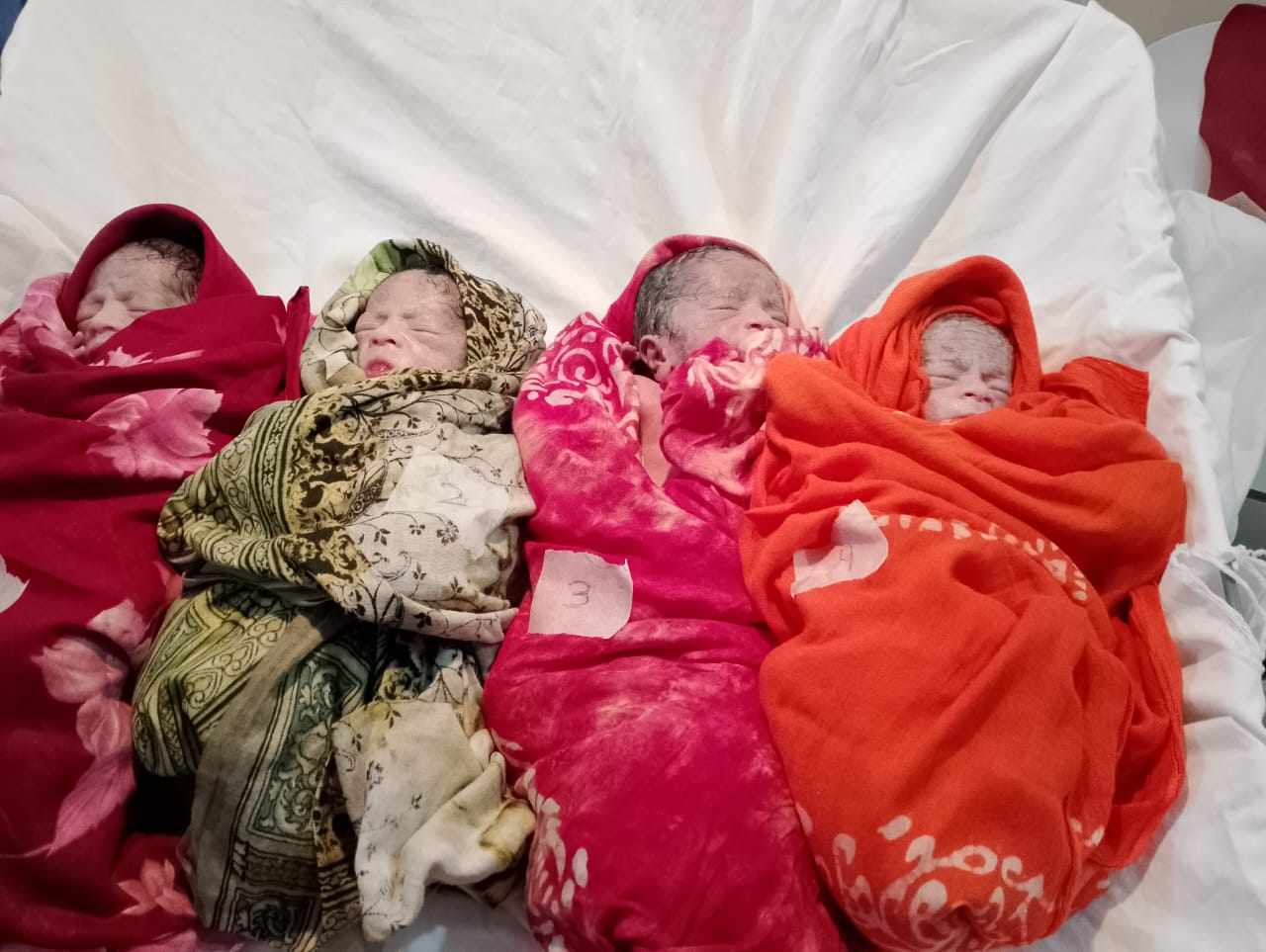 এনাম মেডিকেল কলেজ হাসপাতালের ওটি ইনচার্জ ডাক্তার নাসির উদ্দিন ঢাকা পোস্টকে বলেন, নরসিংদী থেকে এক গৃহবধূর এক সঙ্গে চারটি কন্যা সন্তানের জন্ম দেন। মা ও নবজাত চার কন্যা উভয়েই সুস্থ্য রয়েছে। চার কন্যার মধ্যে প্রথম কন্যার ওজন ছিল ১ কেজি ৩’শ গ্রাম, দ্বীতিয় কন্যা ১ কেজি ২’শ গ্রাম, ,তৃতীয় কন্যার ওজন ১ কেজি ৩’শ গ্রাম ও চর্তুথ কন্যার ওজন ১ কেজি ২’শ ছিল বলে জানান তিনি।