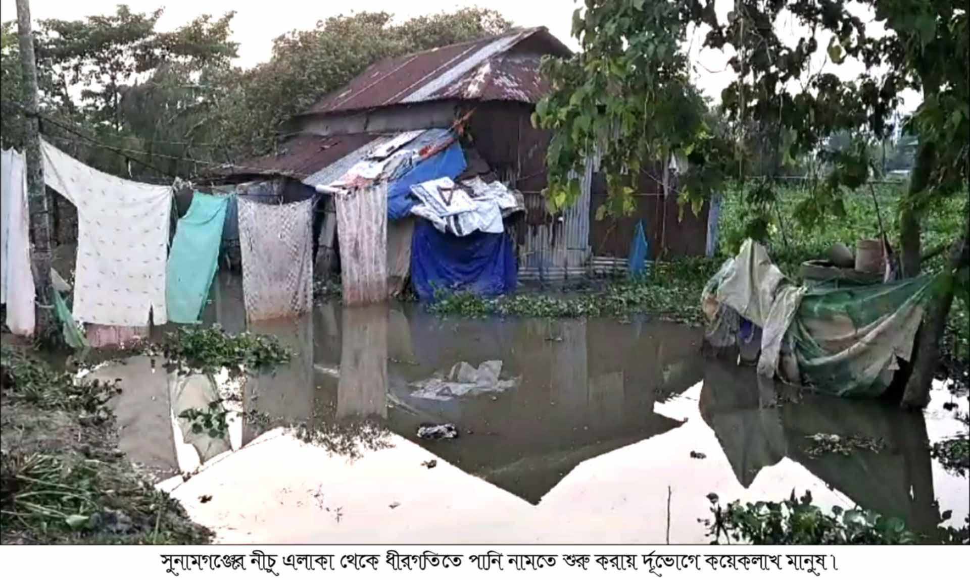 সুনামগঞ্জ প্রতিনিধি:বৃষ্টি না হওয়ায় ও পাহাড়ি ঢলের পানি কম আসায় সুনামগঞ্জের সুরমা নদীর পানি হ্রাস পেয়ে বন্যা পরিস্থিতির অনেকটা উন্নতি হয়ে উচুঁ স্থান থেকে পানি নামতে শুরু করলে ও শহরের কালীপুর, পূর্ব নতুনপাড়া,পশ্চিম নতুনপাড়া, বাধঁনপাড়া, বড়পাড়াসহ ১২টি উপজেলার নীচু এলাকা হতে ধীরগতিতে পানি নামতে শুরু করায় চরম র্দূভোগে রয়েছেন প্রায় ৯ লাখ পানিবন্দী মানুষ।