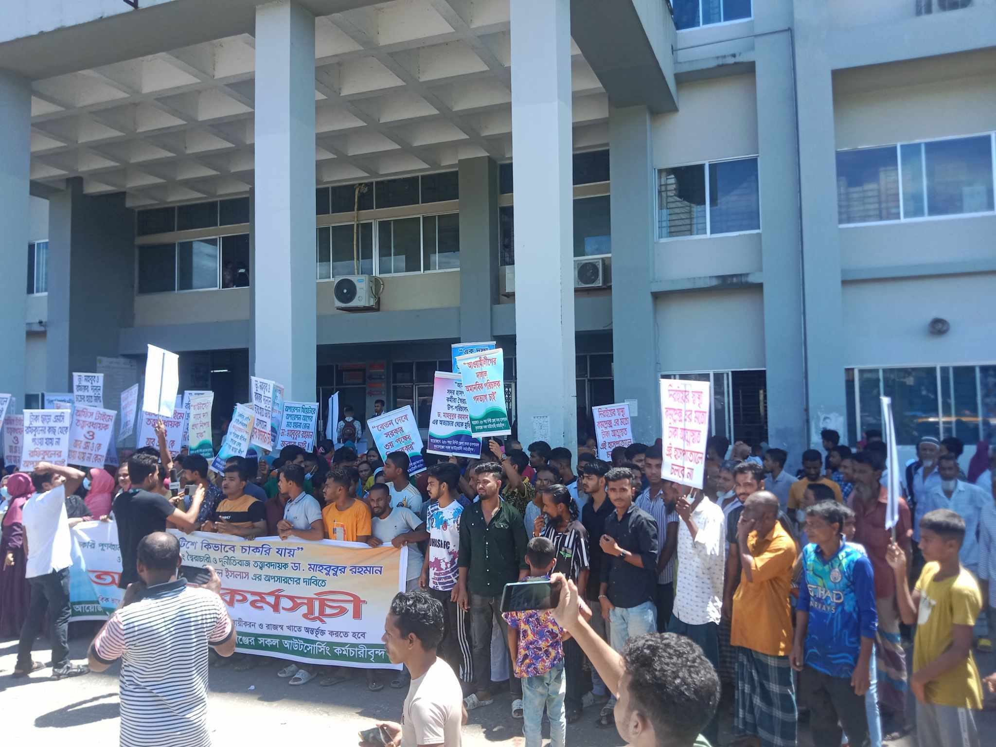 বিভিন্ন পদে কর্মরত ৬৪জন কর্মীদের একটানা দাবি আদায়ের আন্দোলন শুরু হয়েছিল গত ১৮ই জুলাই।গত ছয় দিনের আন্দোলন কর্তৃপক্ষ আমলে না নিলেও আজ হাজারো মানুষের বিক্ষোভ ও উত্তেজনা সামাল দিতে সেনাবাহিনীর হস্তক্ষেপের মাধ্যমে পরিস্থিতি নিয়ন্ত্রণে আসে। রবিবার সকালে খন্ড খন্ড বিক্ষোভ মিছিল দূর্নীতিবাজ ডাঃ মাহবুবুর রহমান ও আরএমও ডাঃ রফিকুল ইসলামের পতন চাই পতন চাই স্লোগানে স্লোগানে হাসপাতালে প্রবেশ করেন হাজারো জনতা। আউটসোর্সিং কর্মীদের দাবী আদায়ের আন্দোলনের পাশাপাশি সদর হাসপাতালে মাষ্টাররোলে স্বেচ্ছাসেবী কর্মীরাও কর্মবিরতি পালন করে দাবী আদায়ের আন্দোলনে যোগদান করেন।